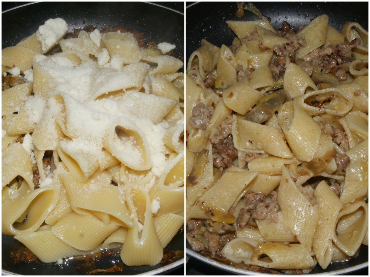 (In alternativa, potete aggiungere i carciofi alla salsiccia senza cuocerli, prolungando la cottura in padella di almeno 10 minuti.)