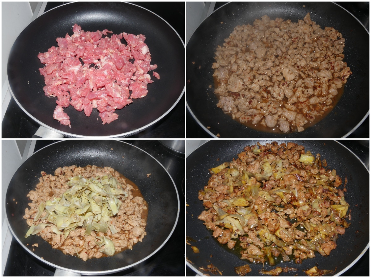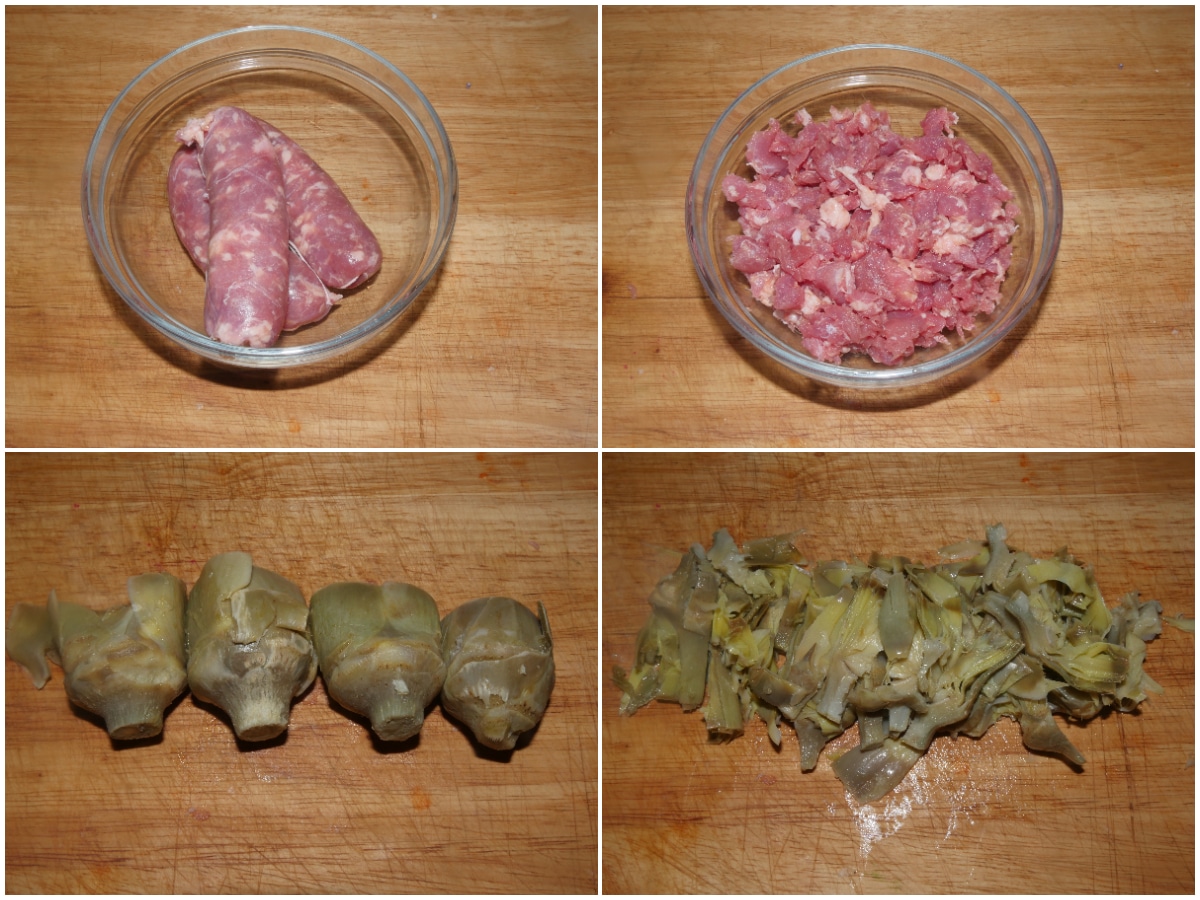 Innanzitutto sgranate la salsiccia eliminando i budelli e dedicatevi ai carciofi: puliteli (qui la guida per vedere come fare), fateli riposare per almeno 10 minuti in acqua acidulata con il succo di limone (in modo che non anneriscano), quindi scolateli e cuoceteli in microonde per 10 minuti o al vapore per 20, infine tagliateli a fettine sottili.