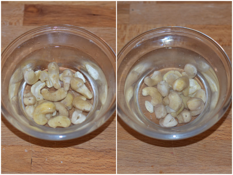 Mettete gli anacardi (tranne quelli per la guarnizione) in una ciotola, coprite con acqua calda e lasciate riposare per 1 oretta.