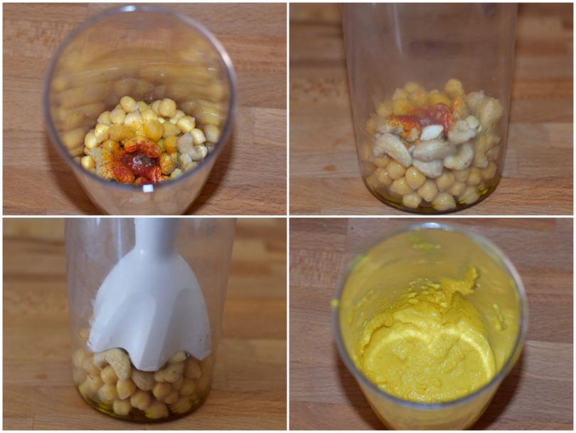 Scolate ceci e anacardi, uniteli in un contenitore con zafferano, sale e olio e frullate con un minipimer (potete anche usare un mixer).