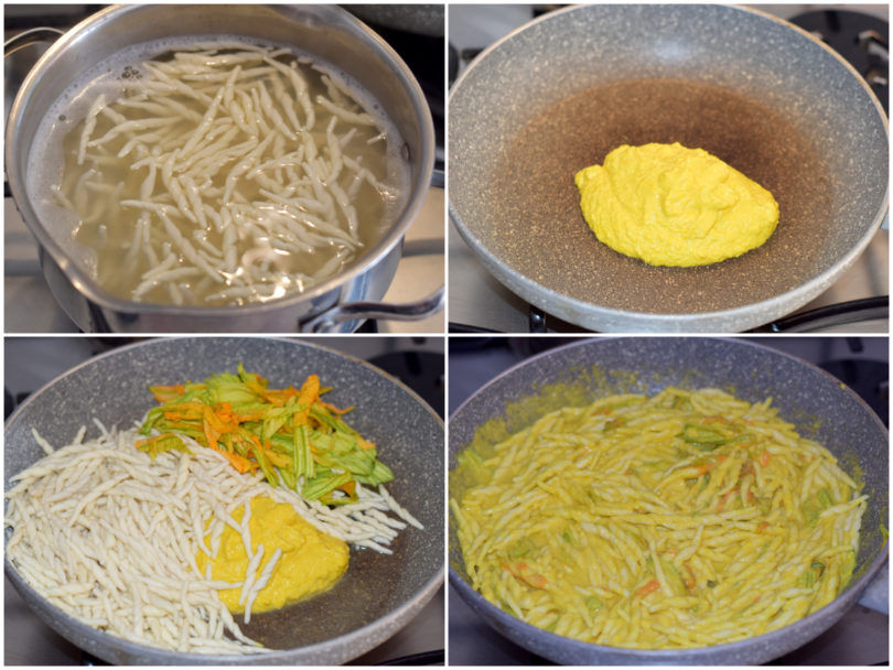 Cuocete la pasta in abbondante acqua bollente leggermente salata, scolatela al dente e mantecatela in padella antiaderente con la crema, i fiori e poca acqua di cottura se serve.