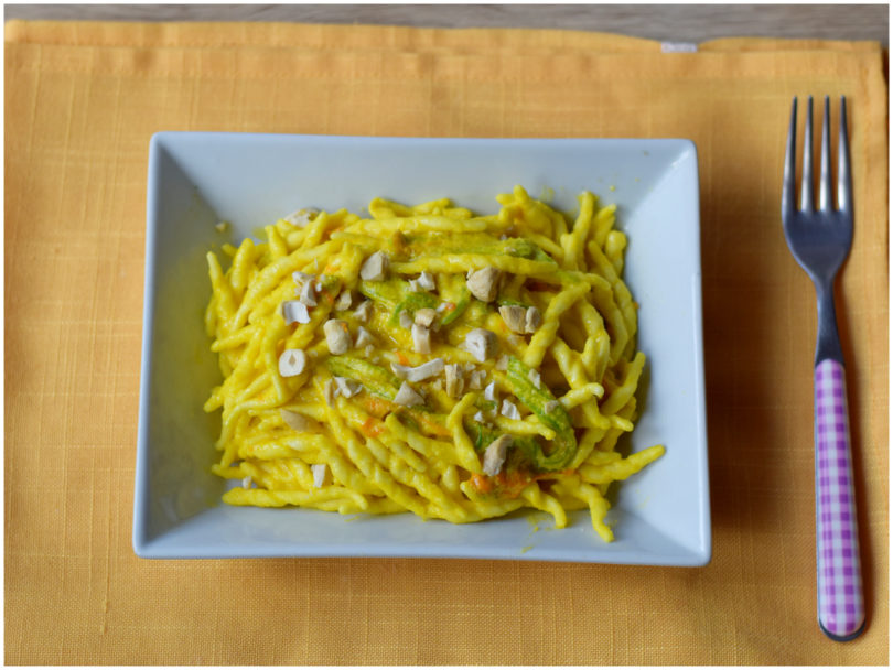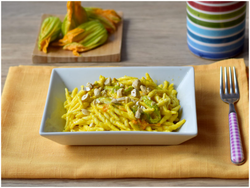 Tutto qui, la pasta ceci e fiori di zucca è pronta e non vi resta che gustarla, guarnendo i piatti con anacardi a piacere.