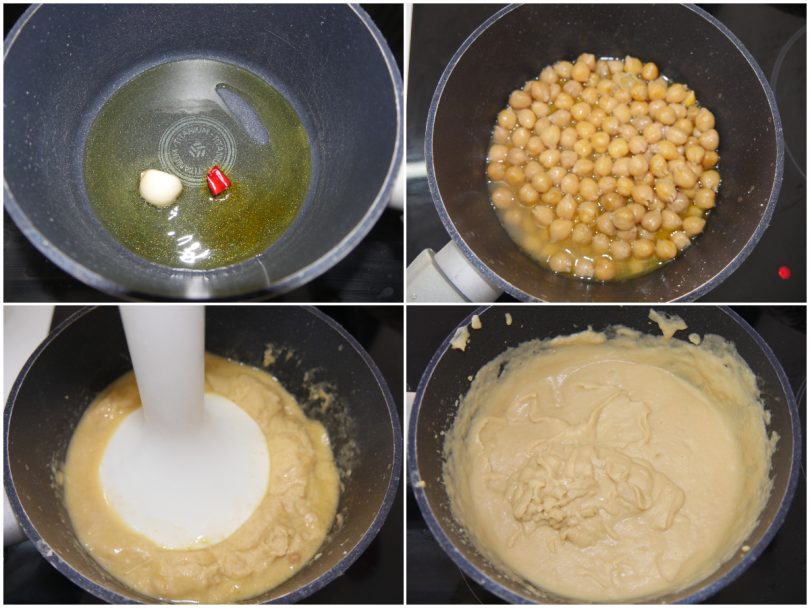 Fate insaporire i ceci (che, vi ricordo, devono essere già cotti) con un soffritto di aglio, olio e peperoncino, quindi aggiungete sale e 2 bicchieri d'acqua, cuocete ancora per qualche minuto, eliminate aglio e peperoncino e frullate fino ad ottenere una crema omogenea.