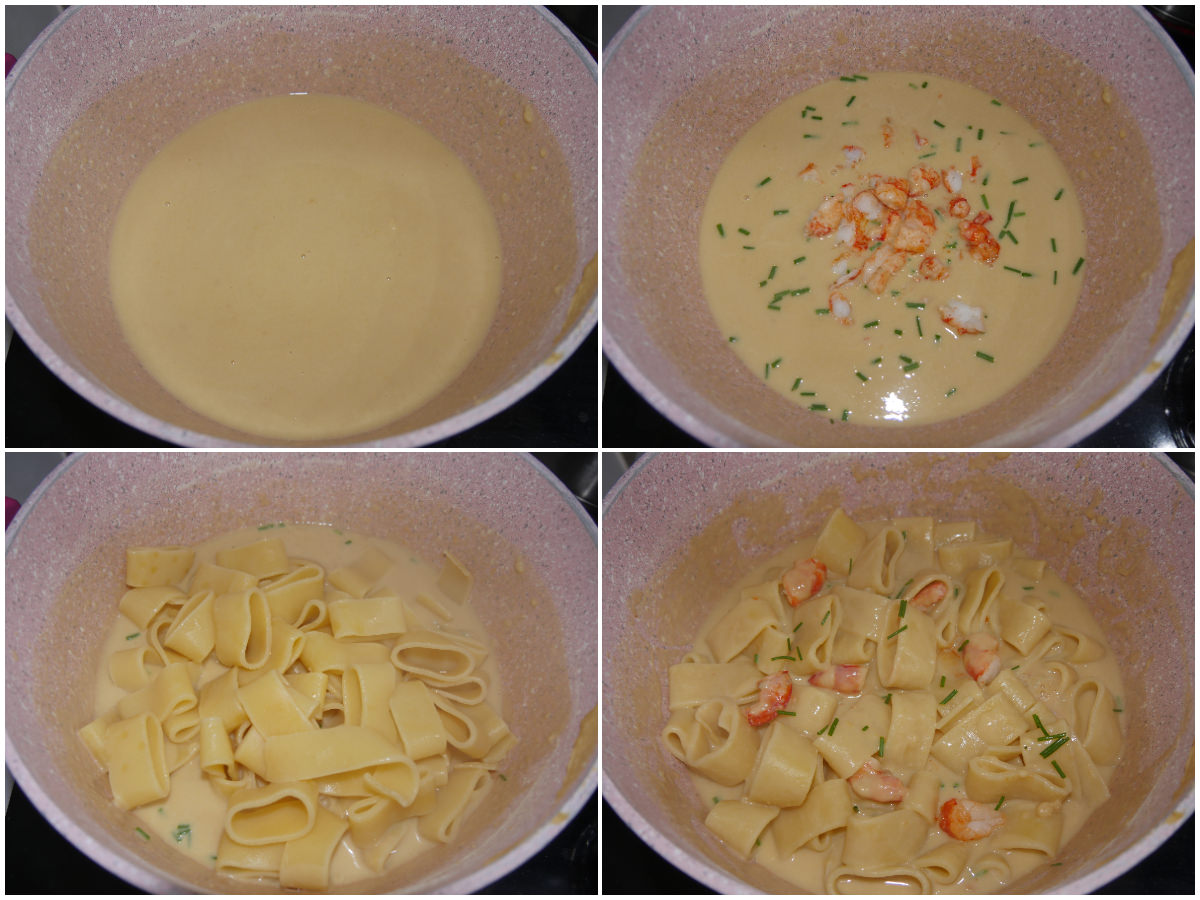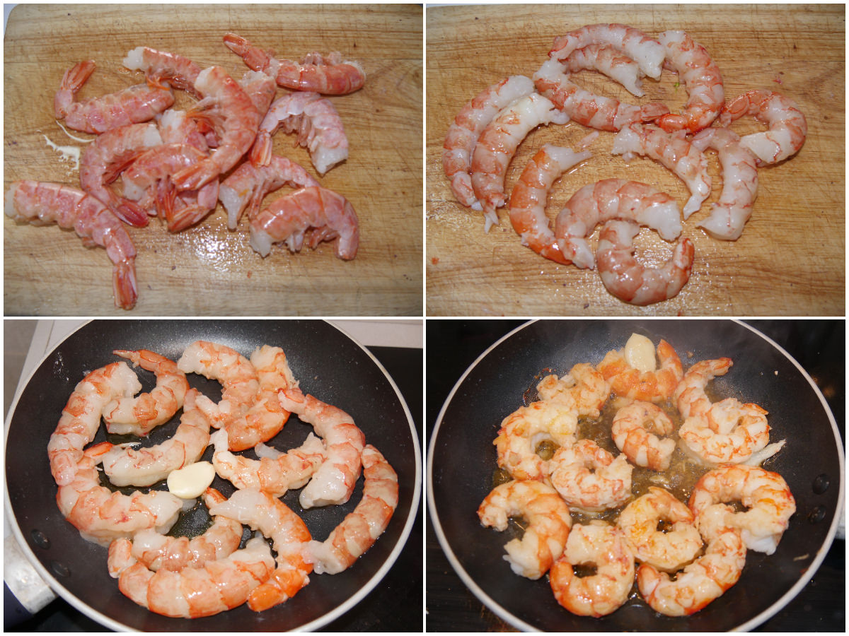 A parte, dopo aver pulito i gamberi, fateli saltare rapidamente in padella antiaderente con aglio e olio.