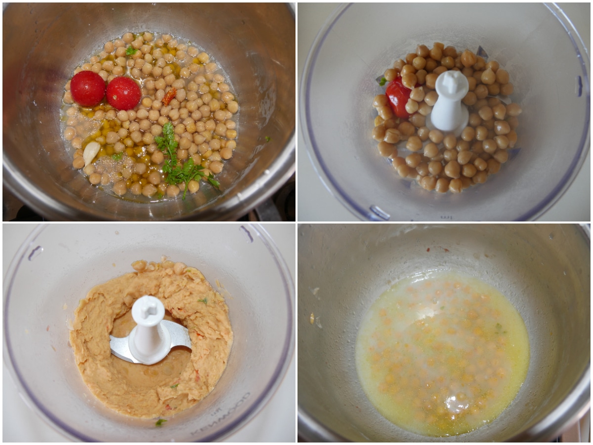 Quando i pomodori si saranno ammorbiditi, eliminate l'aglio e spostate in un mixer metà dei ceci (compresi pomodori e prezzemolo) e frullate.
