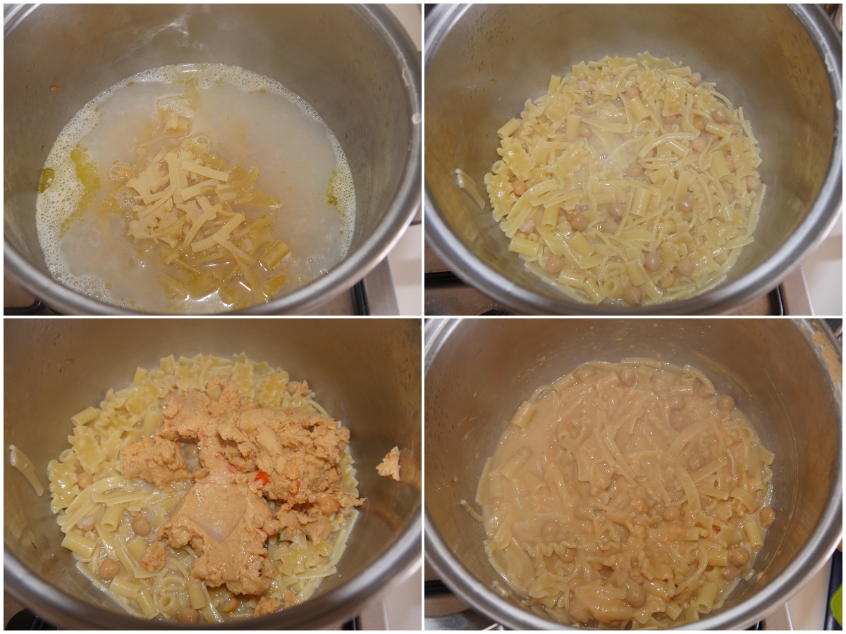 Continuate la cottura, mescolando spesso e aggiungendo altra acqua man mano che serve (come se fosse un risotto) e, una volta quasi cotta, unite anche la crema di ceci.