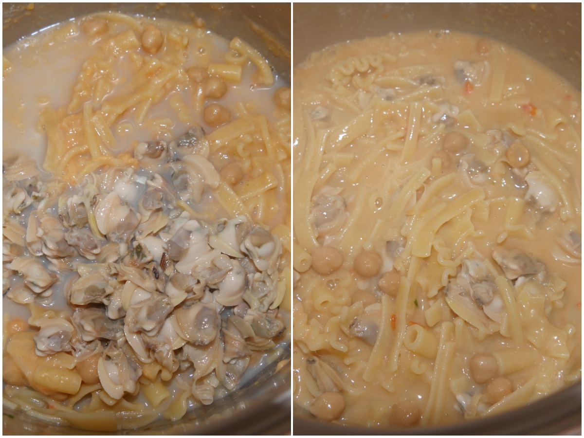 Unite il fondo di cottura dei lupini ai ceci rimasti nella casseruola, aggiungete un po' di acqua, portate a bollore e calate la pasta.