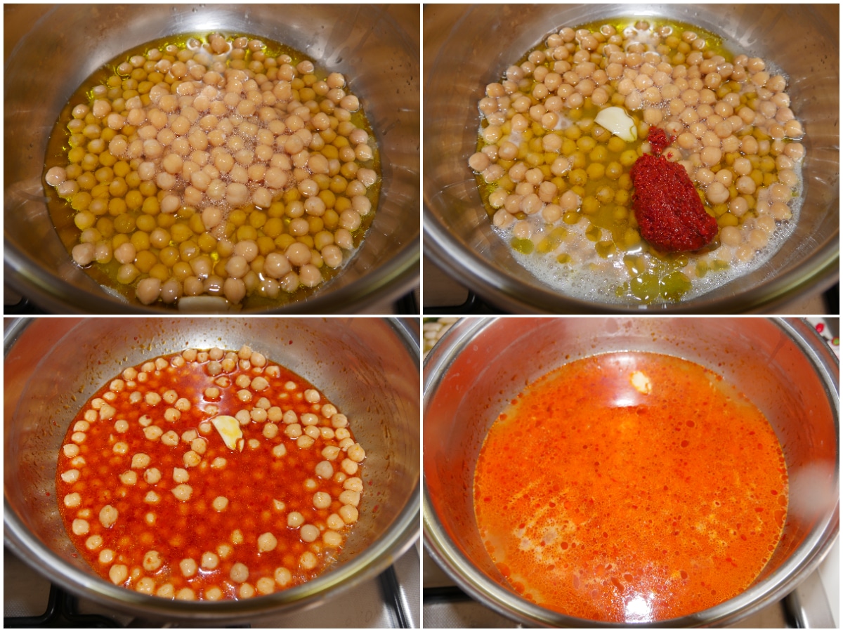 Innanzitutto scolate bene i ceci dal liquido di cottura (o sciacquateli e scolateli da quello di conserva) e fateli insaporire in una casseruola con aglio, olio e nduja.