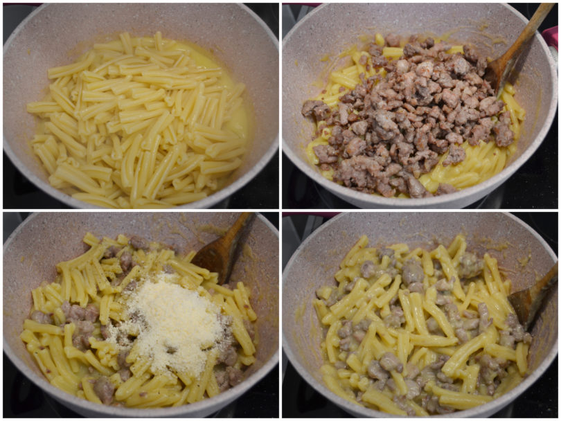 La vostra pasta con crema di patate e salsicce è pronta: impiattate e servitela subito.