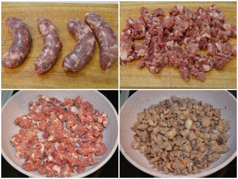Eliminate il budello dalle salsicce e sgranatele un po', quindi fatele rosolare in padella con un filino d'olio.