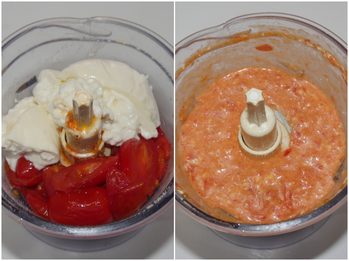 Una volta cotti, conservate qualche pomodorino per la decorazione e frullate il resto insieme alla burrata (potete usare lo stesso mixer di prima, dopo aver tolto il formaggio).