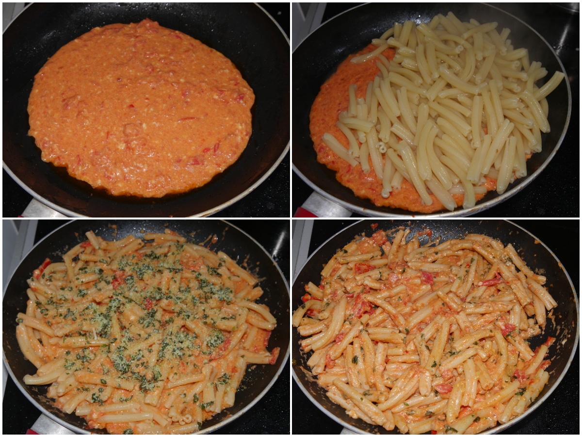 Trasferite la crema di burrata nella stessa padella dove avete cotto i pomodorini, aggiungete la pasta (eventualmente con un pochino della sua acqua di cottura, se il condimento non è abbastanza fluido) e buona parte del formaggio al basilico (conservatene un pochino per la decorazione.