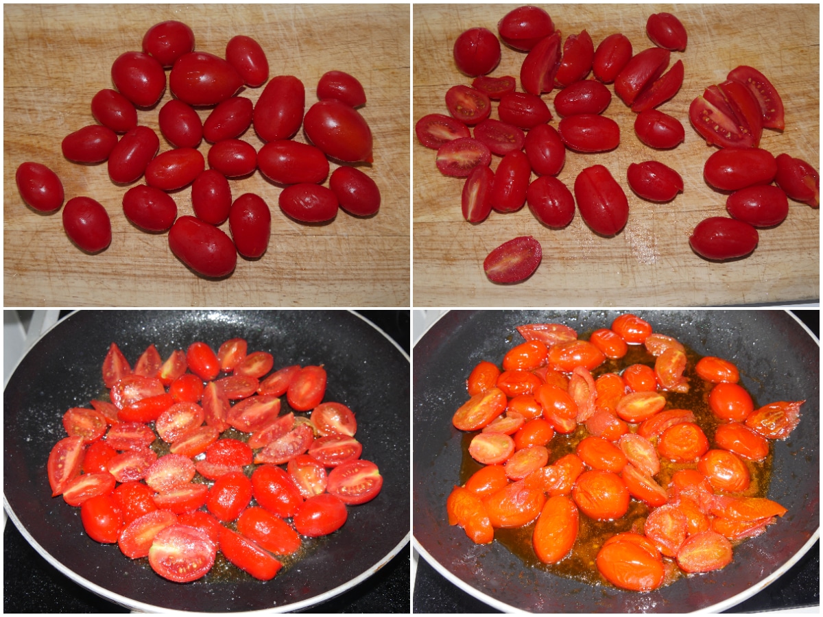 Lavate i pomodorini, tagliateli a metà (o in più parti, se sono grandini) e saltateli in padella a fiamma media con aglio, olio e un pizzico di sale, per circa 10 minuti o finché i pomodorini non inizieranno ad ammorbidirsi.