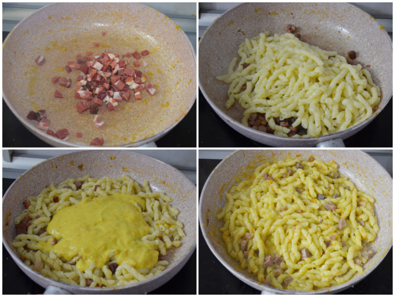 Rosolate ora i cubetti di speck in una padella con un filo d'olio. Scolate la pasta al dente e versatela in padella.