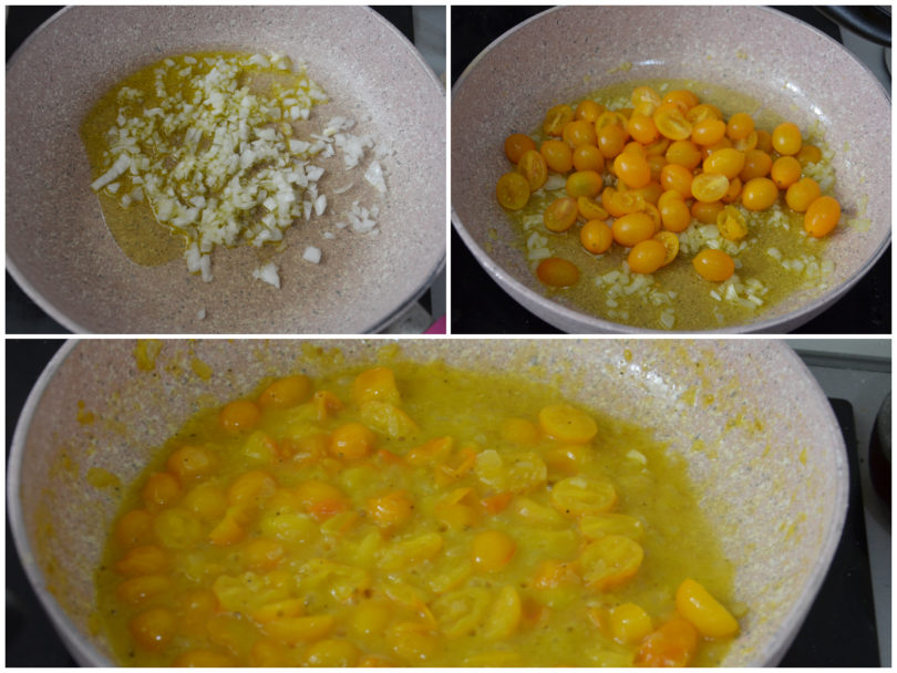 Scaldate dell’olio in una padella capiente e fate rosolare la cipolla tritata. Tagliate ora i pomodorini gialli a metà e aggiungeteli in padella. Fate cuocere per unadecina di minuti con un copercio.