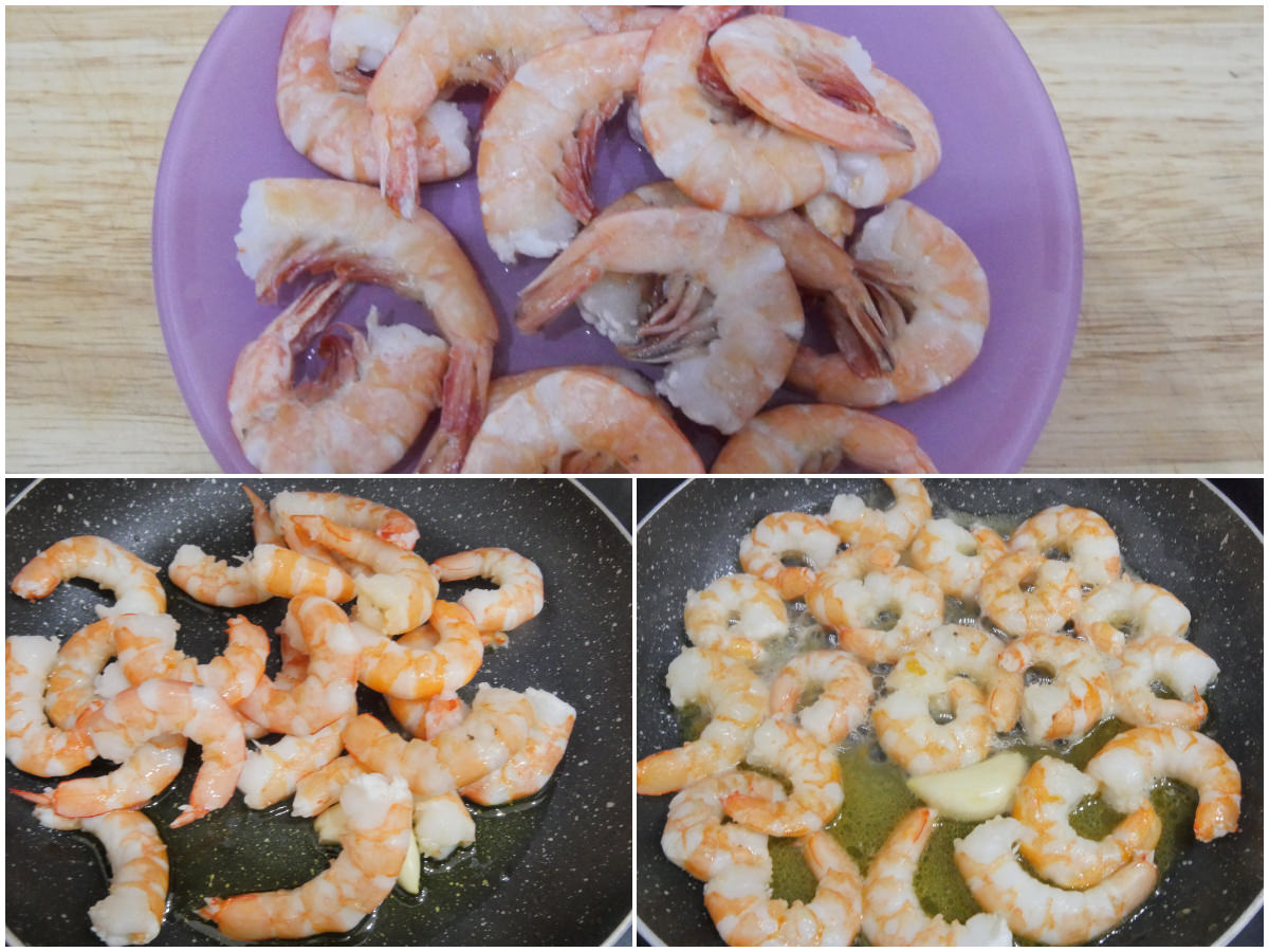 Nel frattempo pulite i gamberi e fateli rosolare per un paio di minuti in un'altra padella con il secondo spicchio di aglio e un po' di olio, poi eliminate l'aglio.