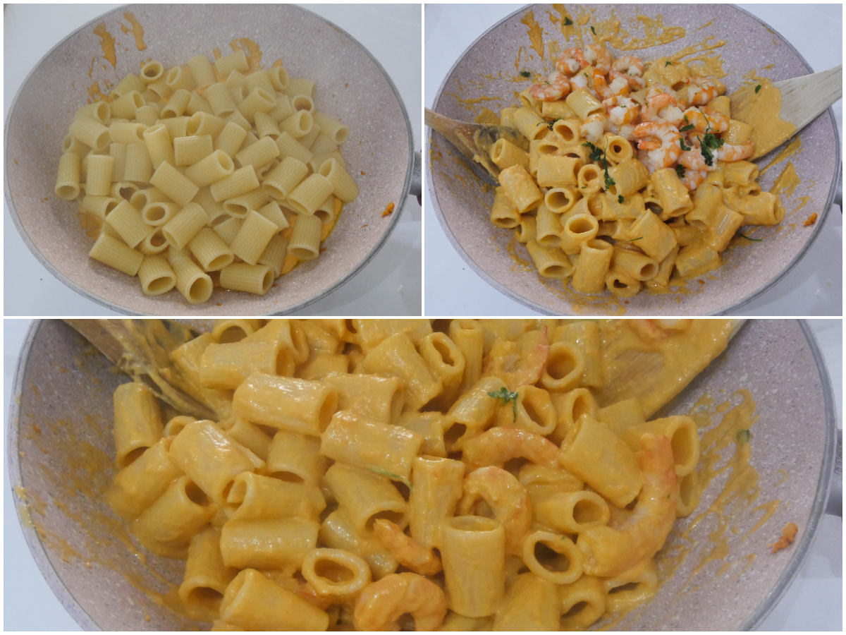 Intanto cuocete la pasta e scolatela ben al dente, quindi unitela alla crema di zucca, aggiungete anche i gamberi e un po' di prezzemolo fresco tritato, aggiustate di sale e pepe e mescolate.