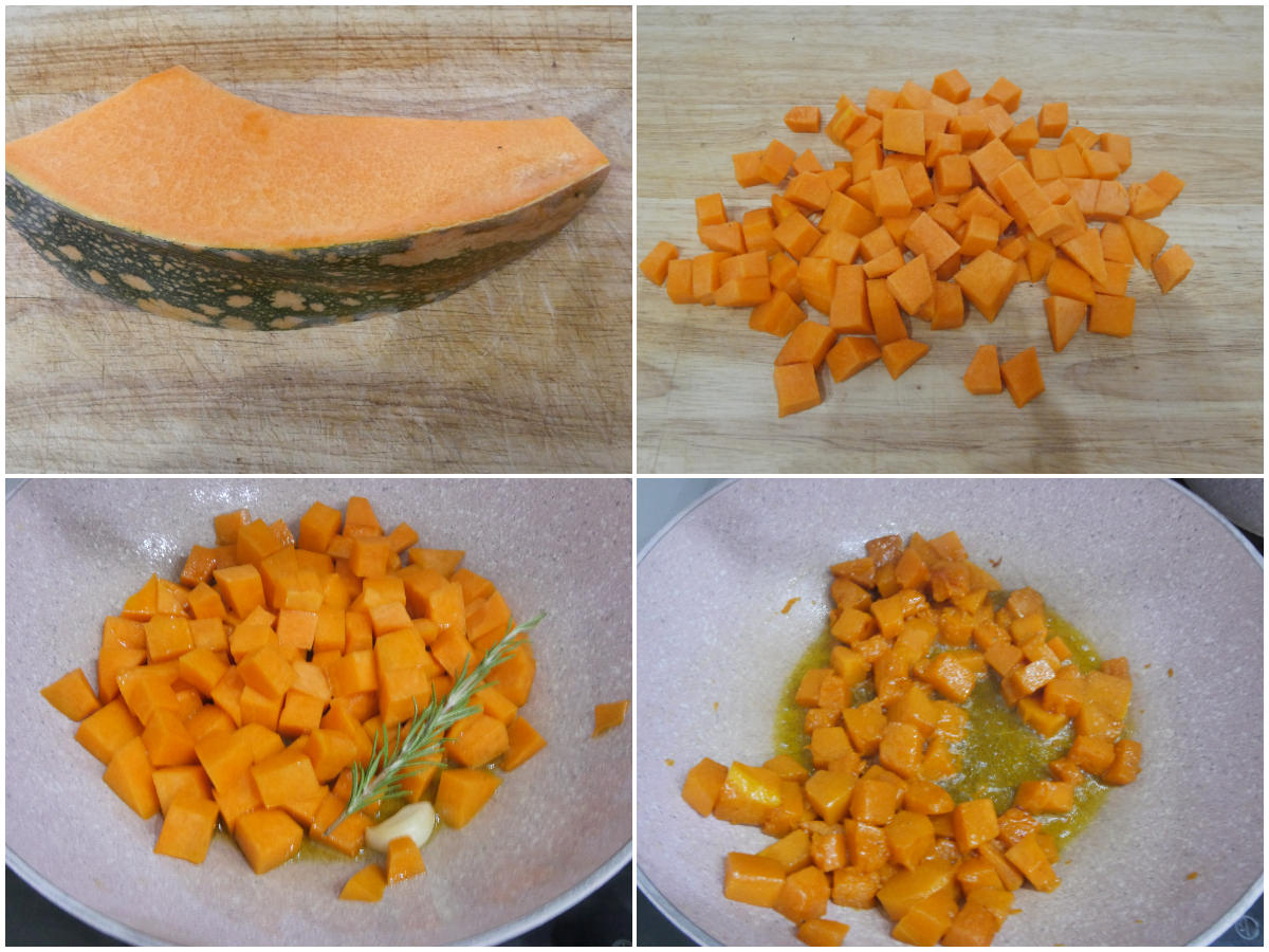 Innanzitutto mondate la zucca e tagliatela a cubettini, quindi fateli rosolare con 1 spicchio di aglio, olio, sale e rosmarino (se mettete un rametto intero, come ho fatto io, dopo lo potrete eliminare) e cuocete con coperchio per almeno 10 minuti (ogni tanto controllate, mescolate, e se necessario aggiungete un po' di acqua, ma non troppa, perché alla fine non devono risultate acquosi), finché non risulteranno ben cotti.
