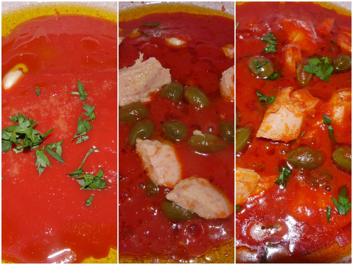 Unite anche capperi (se non vi piacciono, ometteteli; in alternativa, se le gradite, potete aggiungere anche le olive, come nella puttanesca), tonno e un altro po' di prezzemolo, eliminate l'aglio e fate cuocere ancora per qualche minuto, per far insaporire per bene.