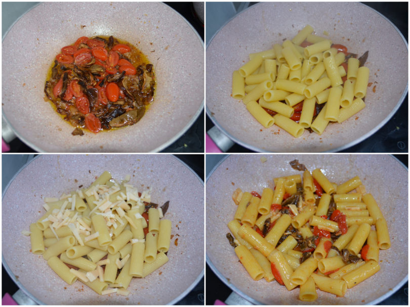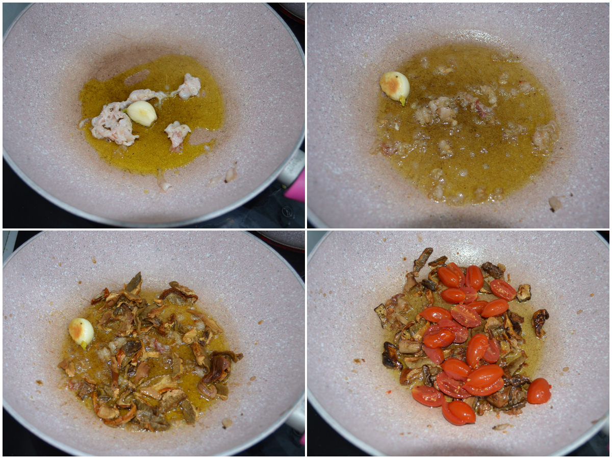 Unite quindi i funghi e fateli rosolare per bene, infine aggiungete anche i pomodorini e cuocete per qualche minuto tutto insieme.