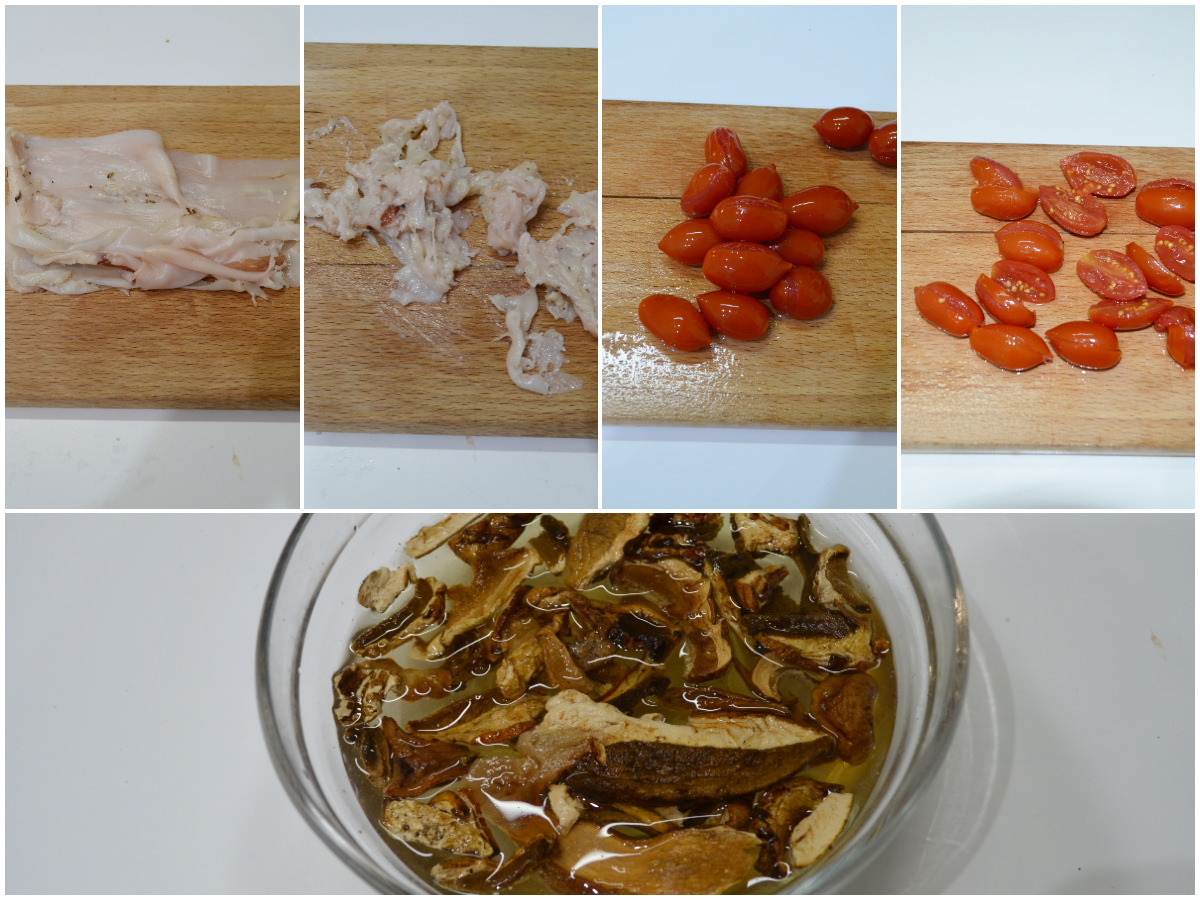 Innanzitutto preparate gli ingredienti: tritate il lardo al coltello, lavate e tagliate i pomodorini, mettete i funghi a bagno in acqua calda per almeno 10 minuti.
