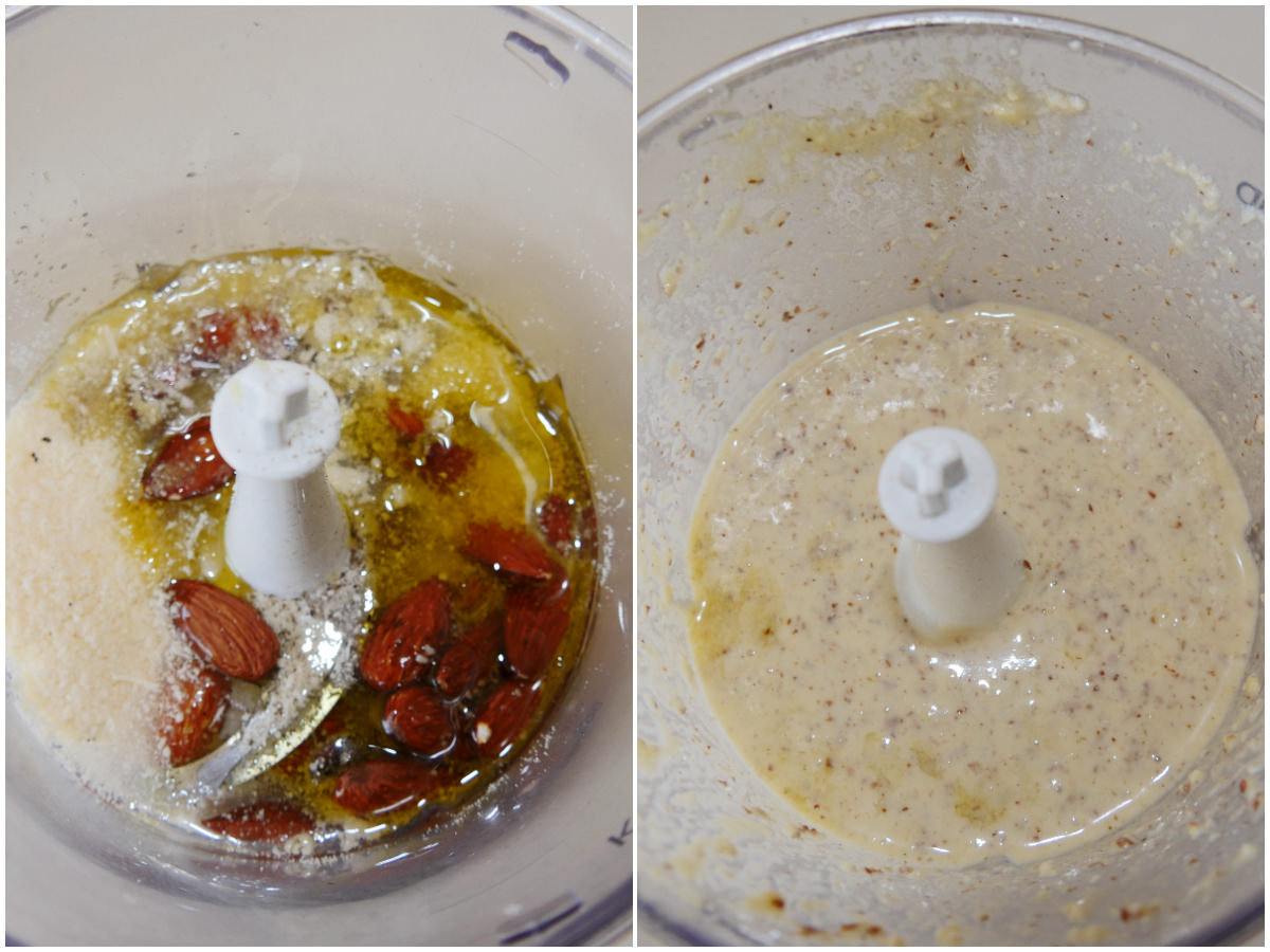 Nel frattempo mettete in un mixer mandorle (tenetene da parte qualcuna per la decorazione), parmigiano, aglio, olio, sale a piacere e 1 mestolo di acqua di cottura della pasta e frullate fino ad ottenere una salsina liscia.