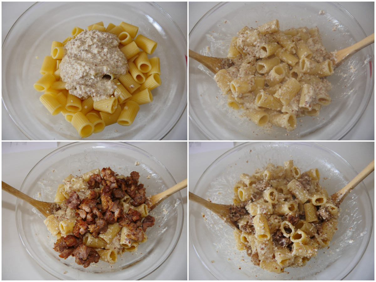 Scolate la pasta al dente, mischiatela con il pesto di mandorle e poi aggiungete anche la salsiccia sbriciolata.