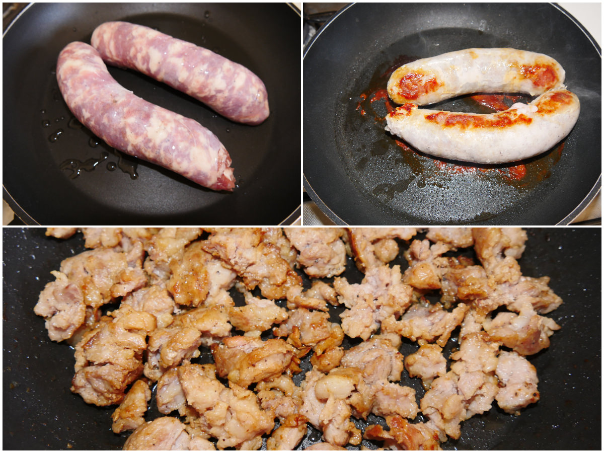 Quindi iniziate a cuocere le salsicce su una padella antiaderente, lasciatele dorare, quindi spezzettatele o sbriciolatele e finite di cuocerle così, girando spesso per farle dorare in maniera uniforma.