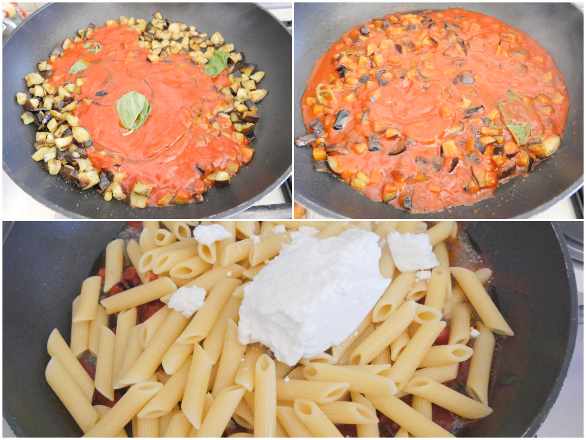 La pasta con melanzane e ricotta è pronta: decorate con basilico fresco e servite subito.