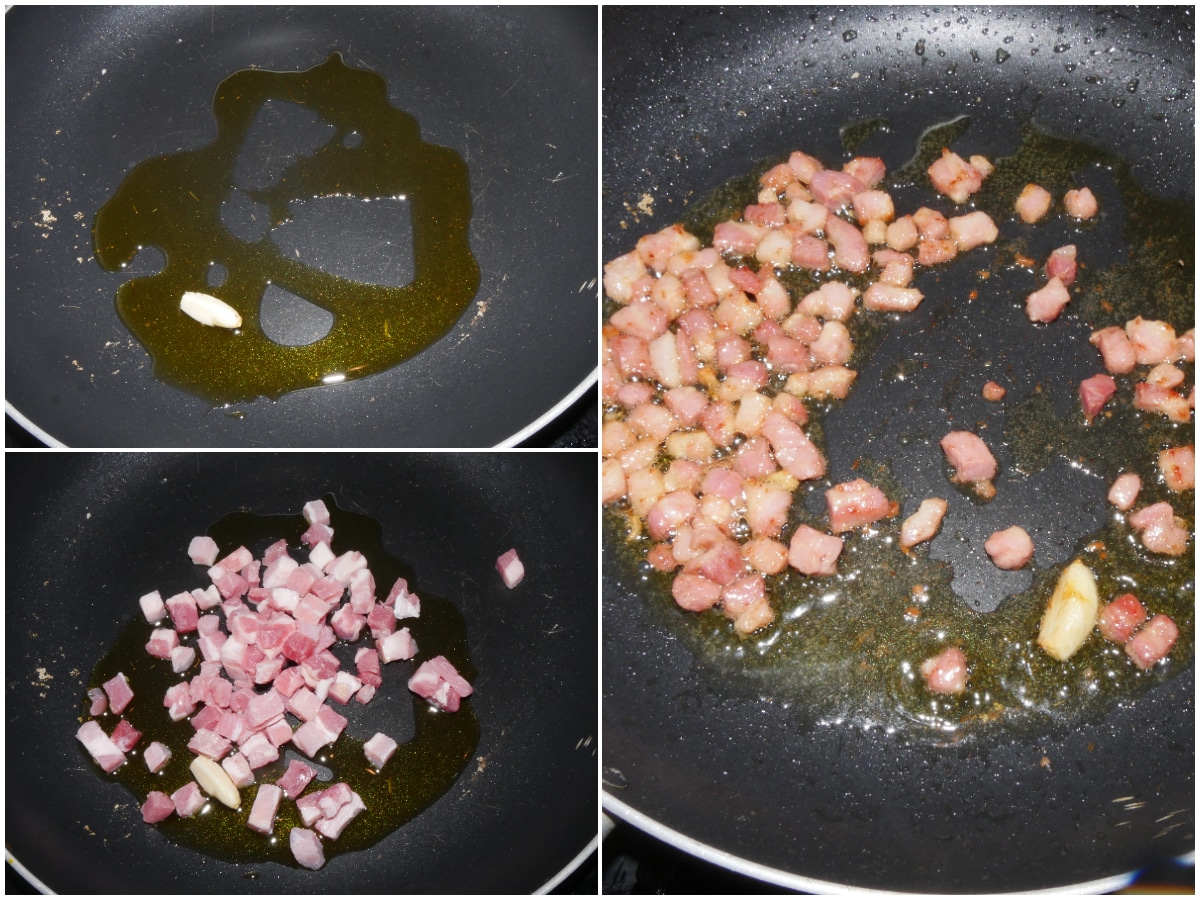 Innanzitutto fate dorare aglio e cipolla in un'ampia padella antiaderente con dell'olio (eventualmente, potete unire anche il peperoncino) ed ovviamente la pancetta.