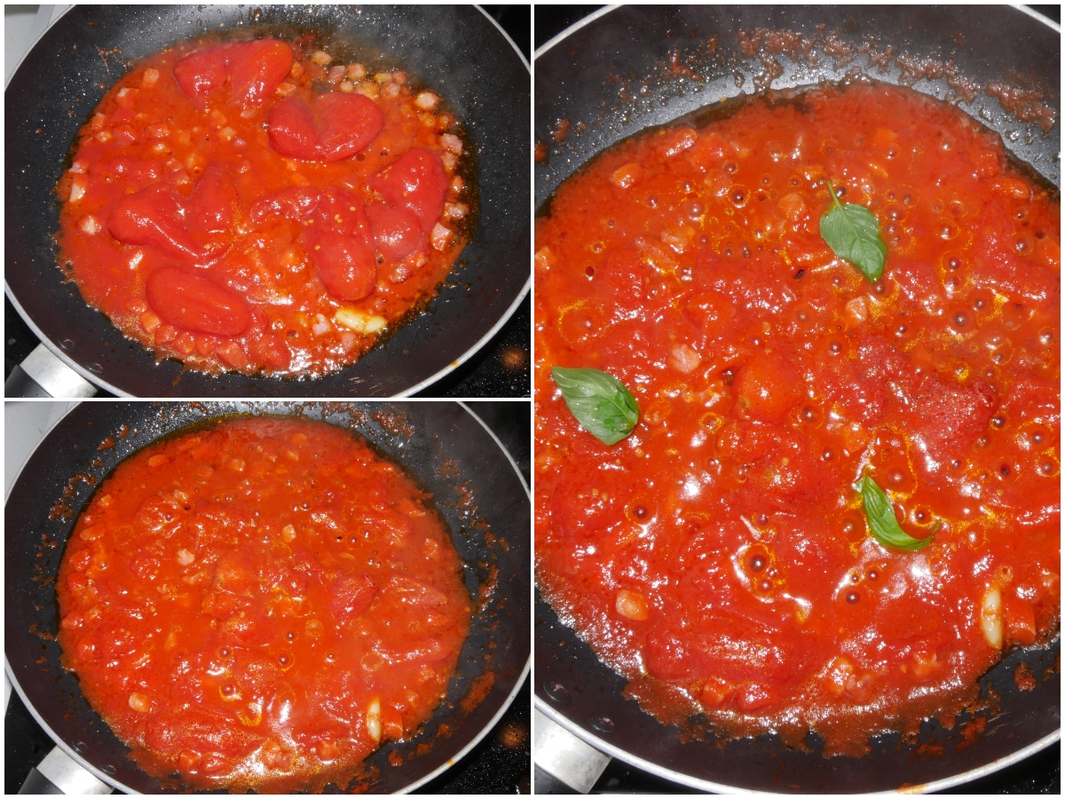 Sfumate con il vino, poi unite i pomodori, schiacciateli con la forchetta e lasciate cuocere a fiamma bassa per almeno 10-15 minuti, poi aggiungete il basilico.