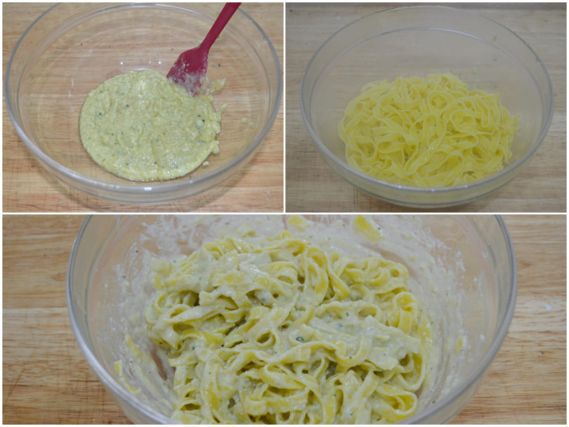 Scolate le tagliatelle al dente, tenendo da parte un po' dell'acqua di cottura, quindi unite la pasta, il pesto e poca acqua di cottura se serve per condire meglio la pasta.