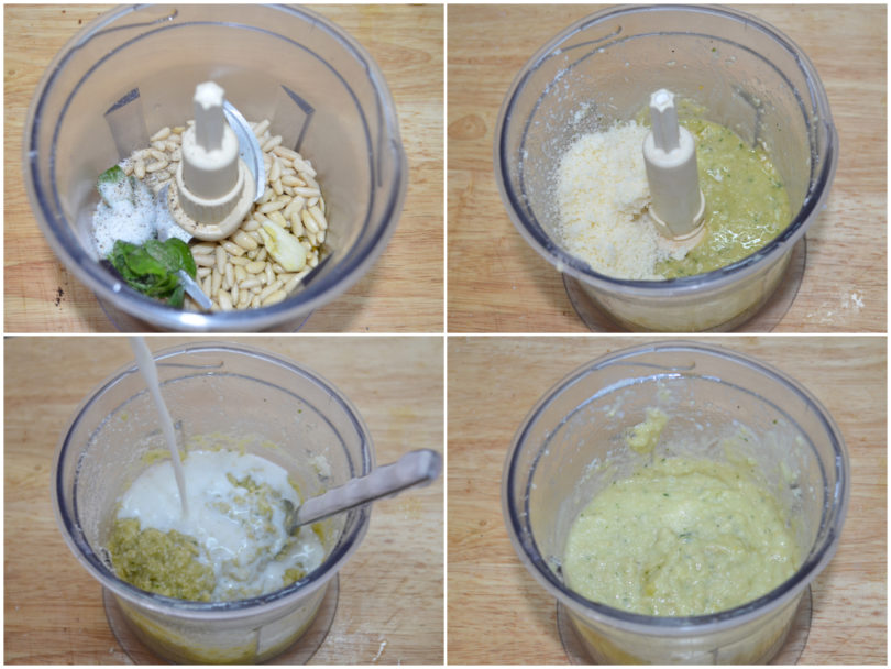 Nel frattempo preparate il pesto di pinoli: mettete in un mixer pinoli, aglio, sale e pepe, basilico (o meglio ancora maggiorana fresca), olio e parmigiano e iniziate a frullare.