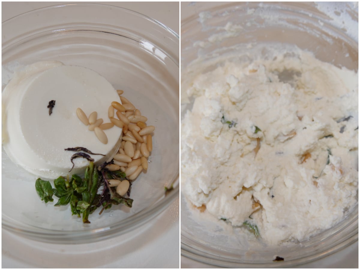 Mettete in una ciotola ricotta, pecorino, basilico tritato e pinoli e amalgamate (volendo potete aggiungere anche un po' di pepe).