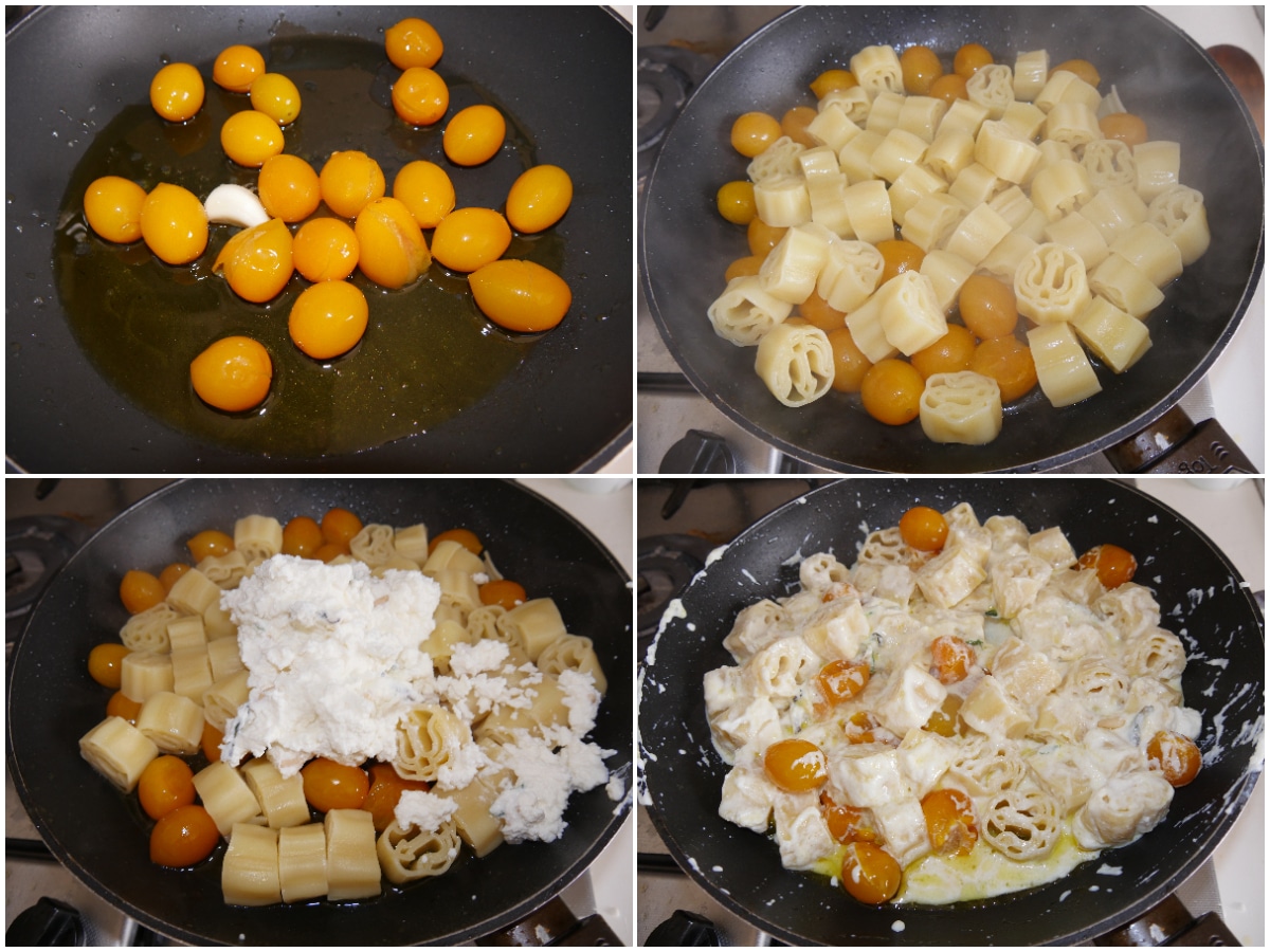 Fate cuocere i pomodorini con aglio, olio e sale per una decina di minuti, quindi togliete l'aglio e aggiungete la pasta: fatela insaporire nel condimento e mantecate con la crema di ricotta, aggiungendo acqua di cottura se serve.