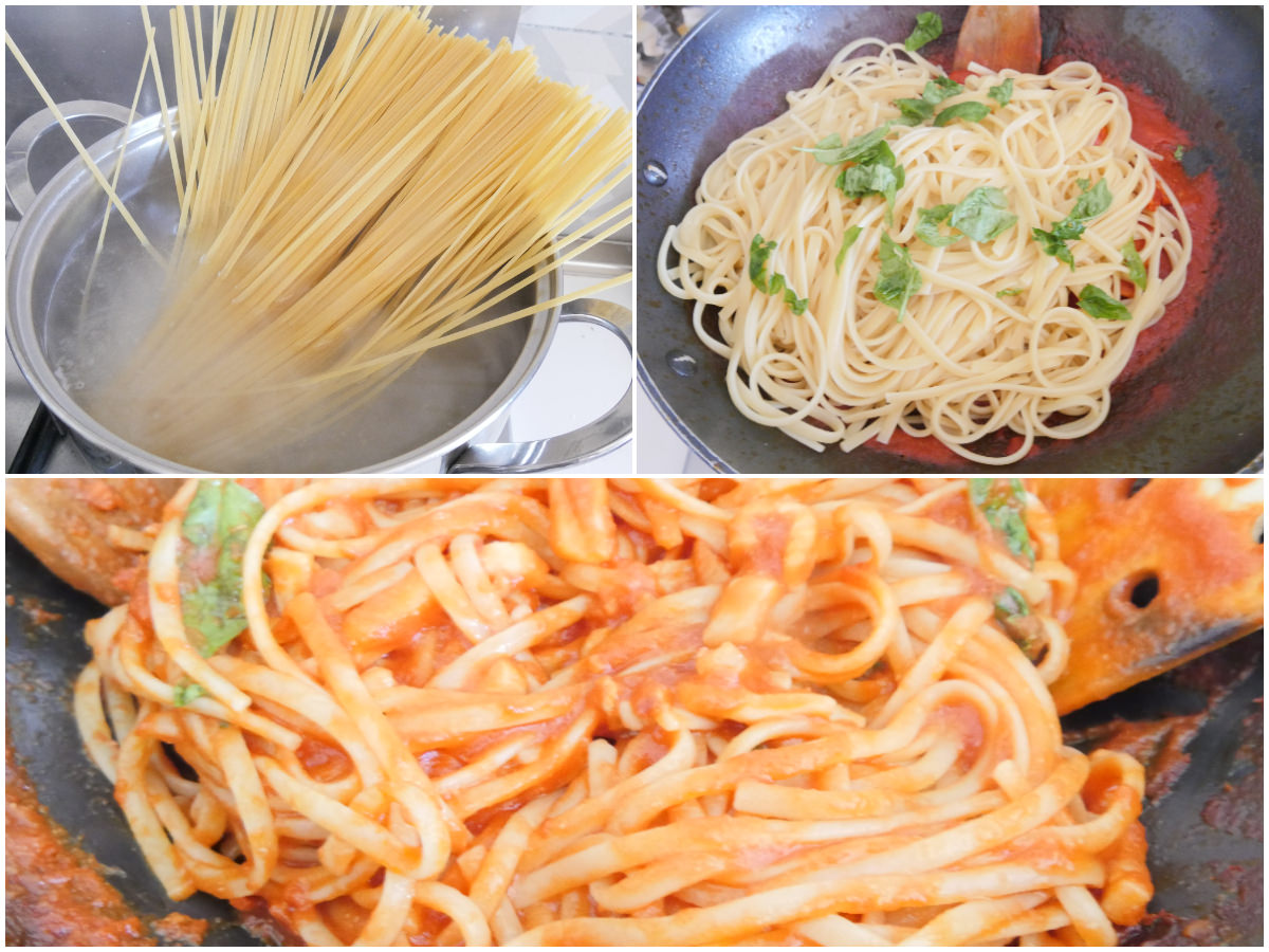 nel frattempo cuocete la pasta in abbondante acqua salata, scolatela ben al dente e aggiungetela al sugo, insieme a tanto basilico fresco spezzettato (se necessario, aggiungete un po' di acqua di cottura della pasta) e mescolate bene.