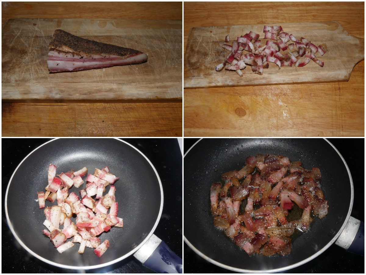 Tagliate il guanciale a listarelle e fatelo rosolare in una padella antiaderente (senza aggiungere olio) fino a far sciogliere parte del grasso e a rendere il guanciale dorato e croccante.