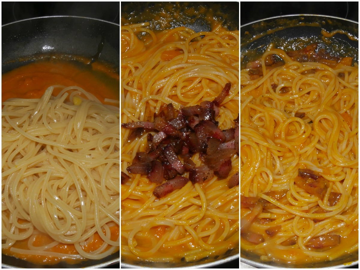Scolate la pasta al dente e unitela alla crema di zucca, quindi aggiungete anche 2/3 del guanciale (così da usare il restante guanciale per decorare i piatti).