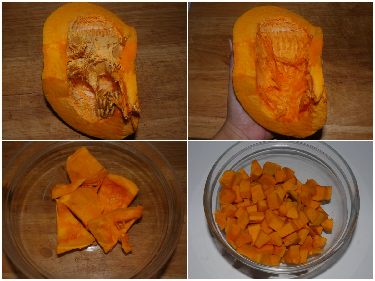 Pulite la zucca eliminando buccia esterna e filamenti interni, quindi tagliate la polpa a dadini.