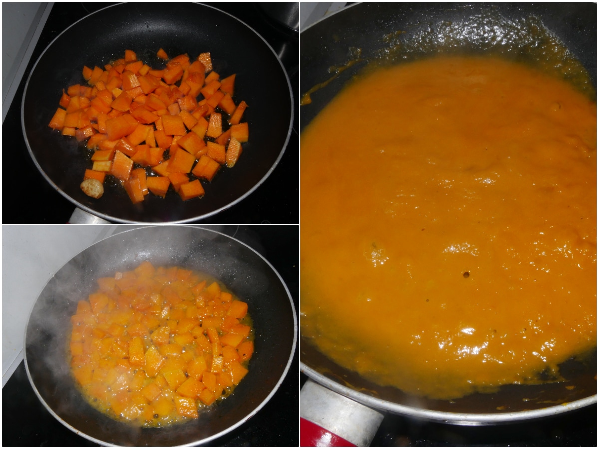 Fate scaldare un filo d'olio in un'ampia padella antiaderente, aggiungete la zucca, lasciate ammorbidire, quindi condite con un pizzico di sale, coprite con acqua e lasciate cuocere finché la zucca non risulterà tanto morbida da poterla schiacciare con la forchetta, quindi frullatela.