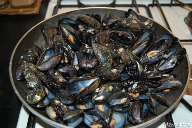 Mettete le cozze in una padella, coprite con un coperchio e fatale cuocere per 5/10 minuti o fino a che non si aprano le valve.