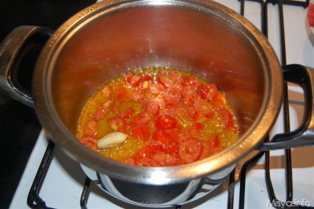 In un'ampia casseruola fate soffriggere uno spicchio d'aglio, aggiungete quindi i pomodorini maturi tagliati a dadini e fate cuocere qualche minuto.