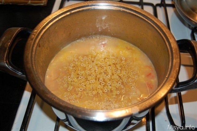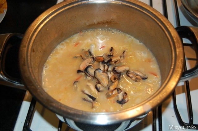 A meta' cottura aggiungere le cozze precedentemente sgusciate, mescolare e terminare la cottura.