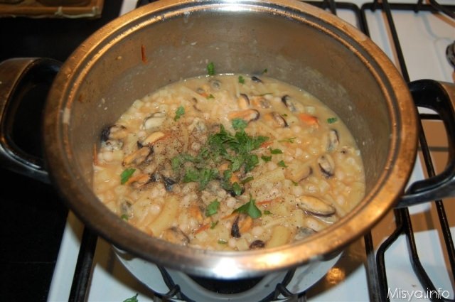 Spegnere la fiamma, aggiungere alla pasta e fagioli con le cozze il pepe e il prezzemolo tritato e se necessario, aggiustate di sale.