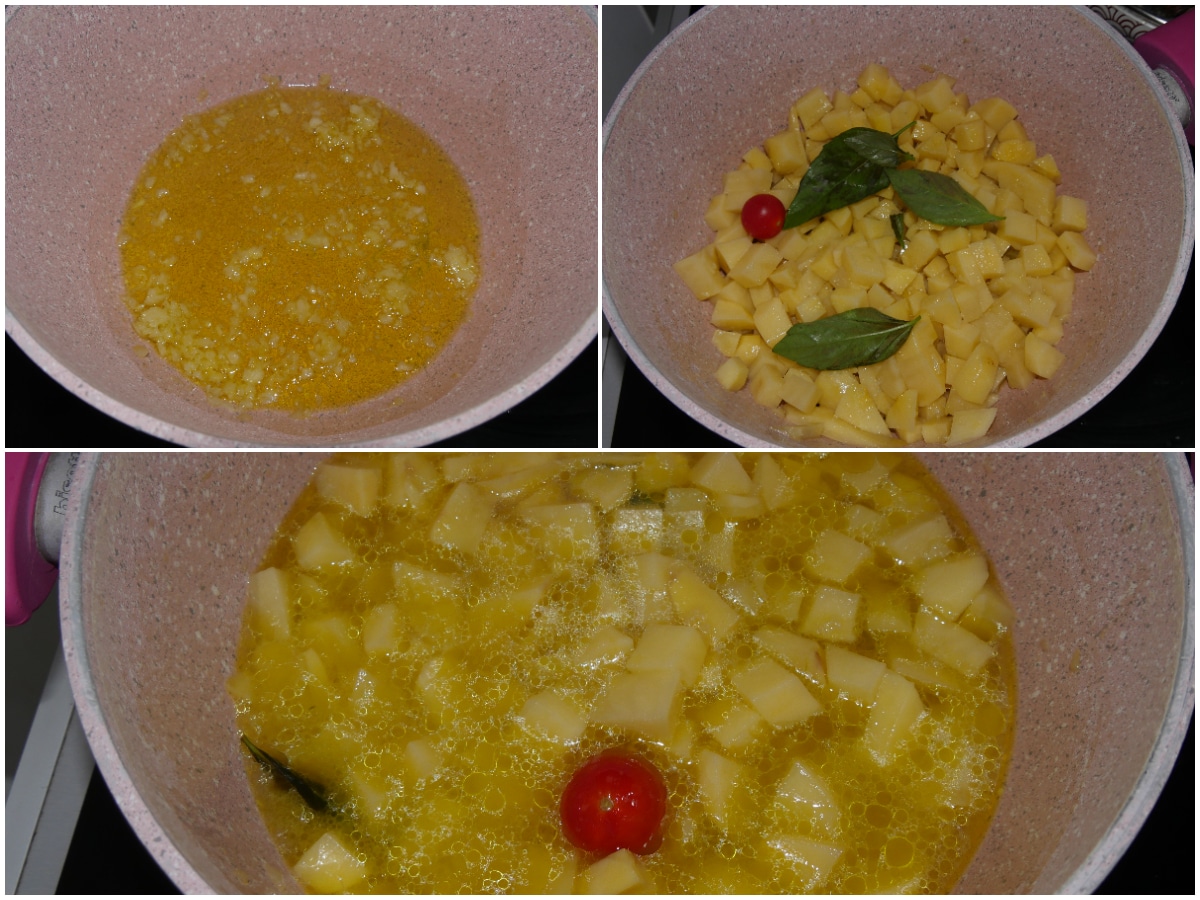 Mondate e tritate la cipolla e fatela soffriggere in una casseruola con dell'olio, quindi unite pomodori e basilico lavati insieme con le patate, fate insaporire per un paio di minuti, quindi unite il fondo di cottura delle vongole e acqua fino a coprire completamente le patate, coprite con coperchio e portate a ebollizione.