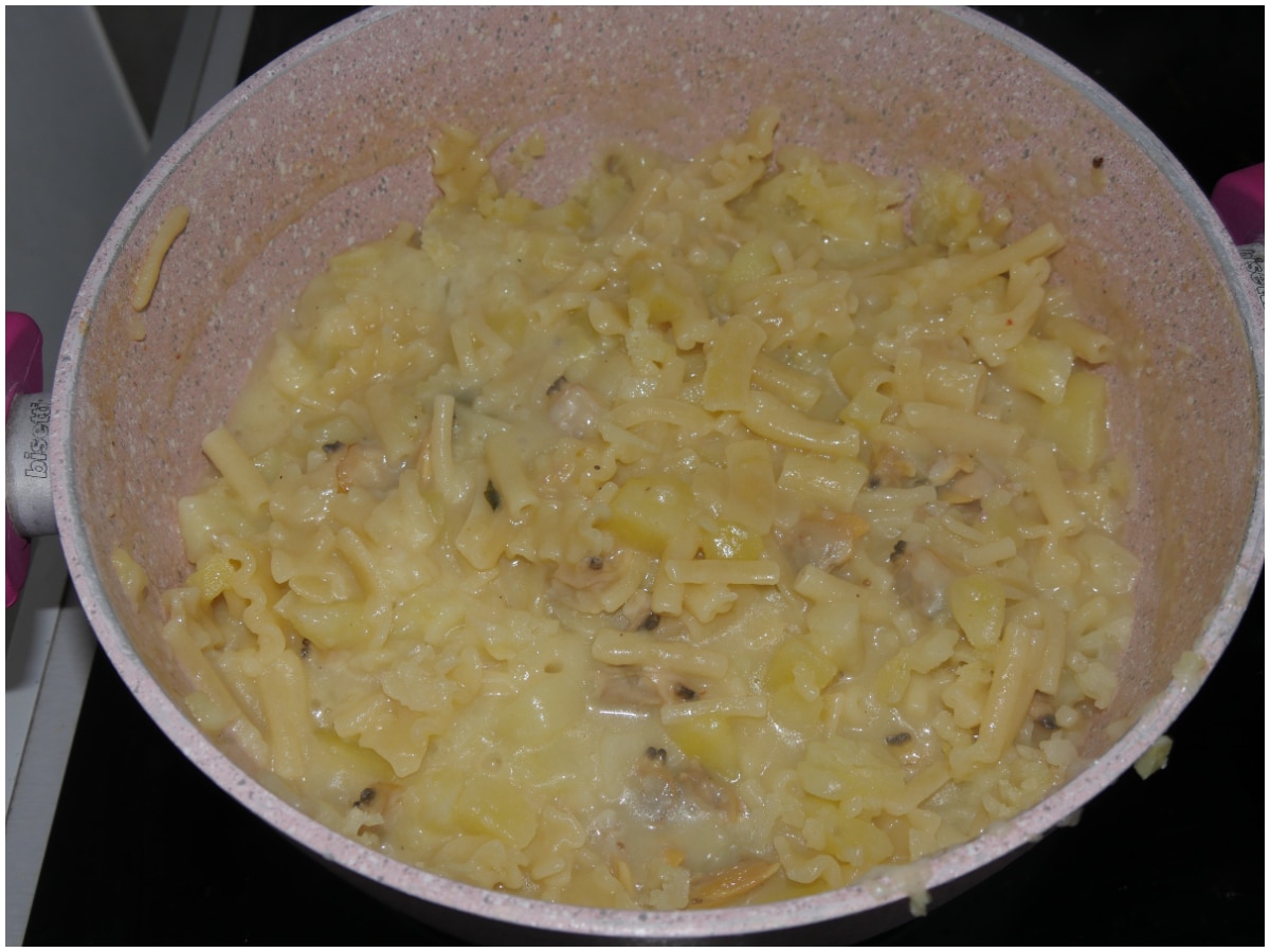 Calate la pasta nelle patate restante e portate a cottura, aggiungendo altra acqua calda solo se necessario.