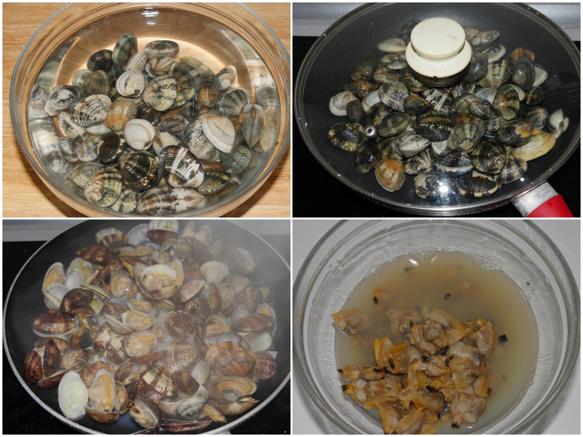 Innanzitutto mettete per almeno 2 ore le vongole in ammollo in acqua fresca, per farle spurgare dalla sabbia, quindi sciacquatele bene sotto acqua corrente, infine cuocete per pochi minuti a fiamma bassa in una casseruola con coperchio, finché non saranno tutte aperte.