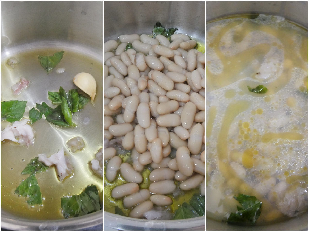 Quando il lardo si sarà sciolto, aggiungete i fagioli e fate insaporire, quindi coprite con acqua e portate a ebollizione.