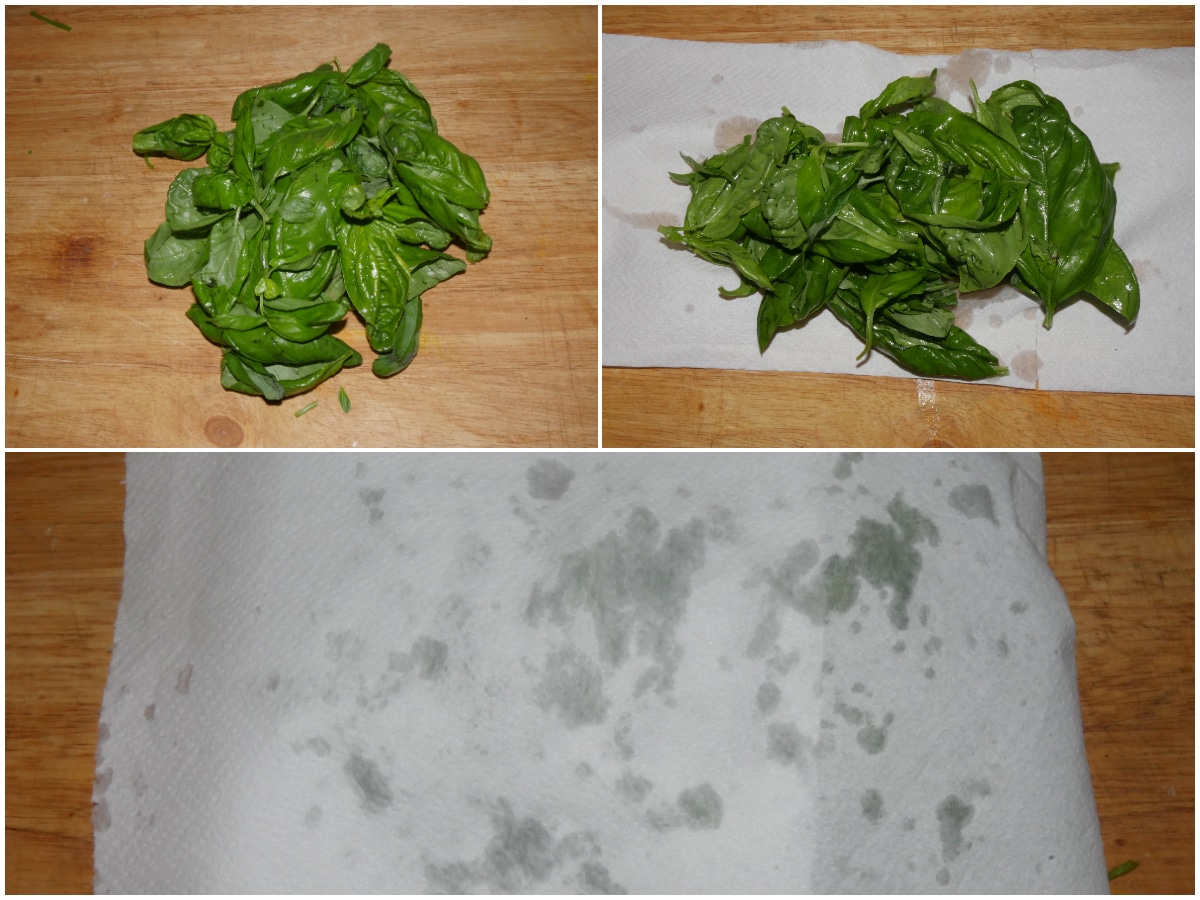 Nel frattempo lavate le foglie di basilico e asciugatele con carta da cucina o un canovaccio pulito, delicatamente.