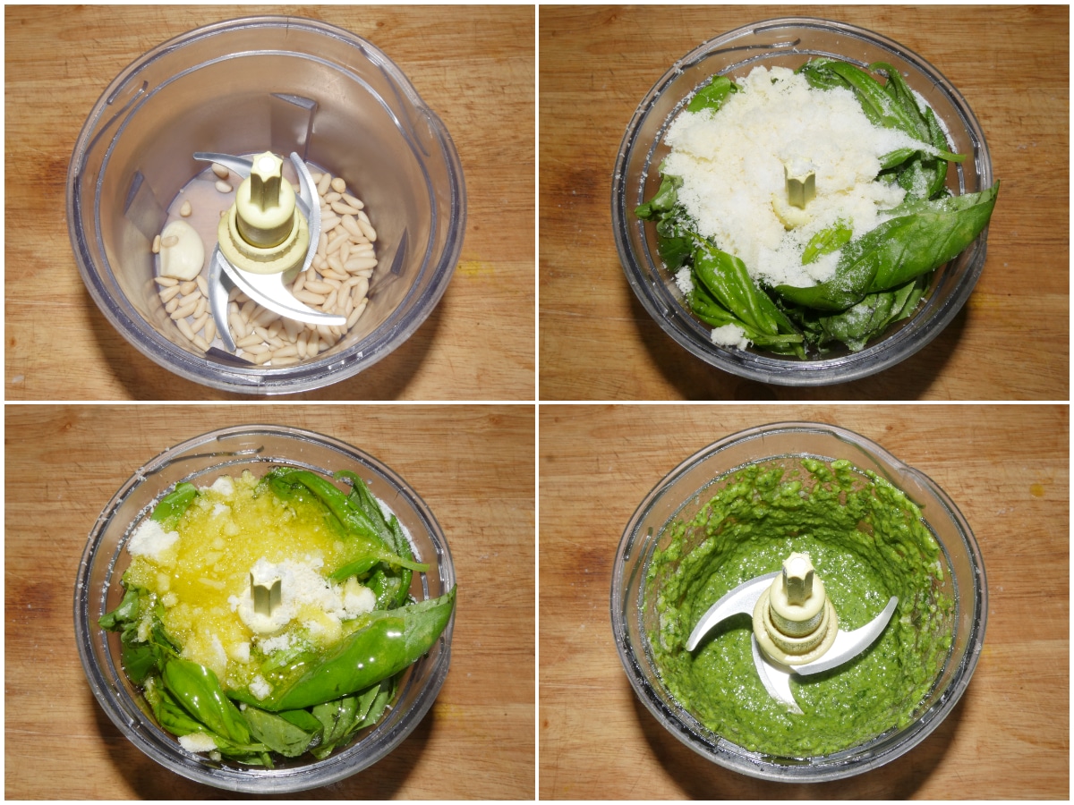 Preparate il pesto: mettete in un mixer basilico, formaggio, aglio, pinoli e olio e frullate fino ad ottenere una salsa omogenea.